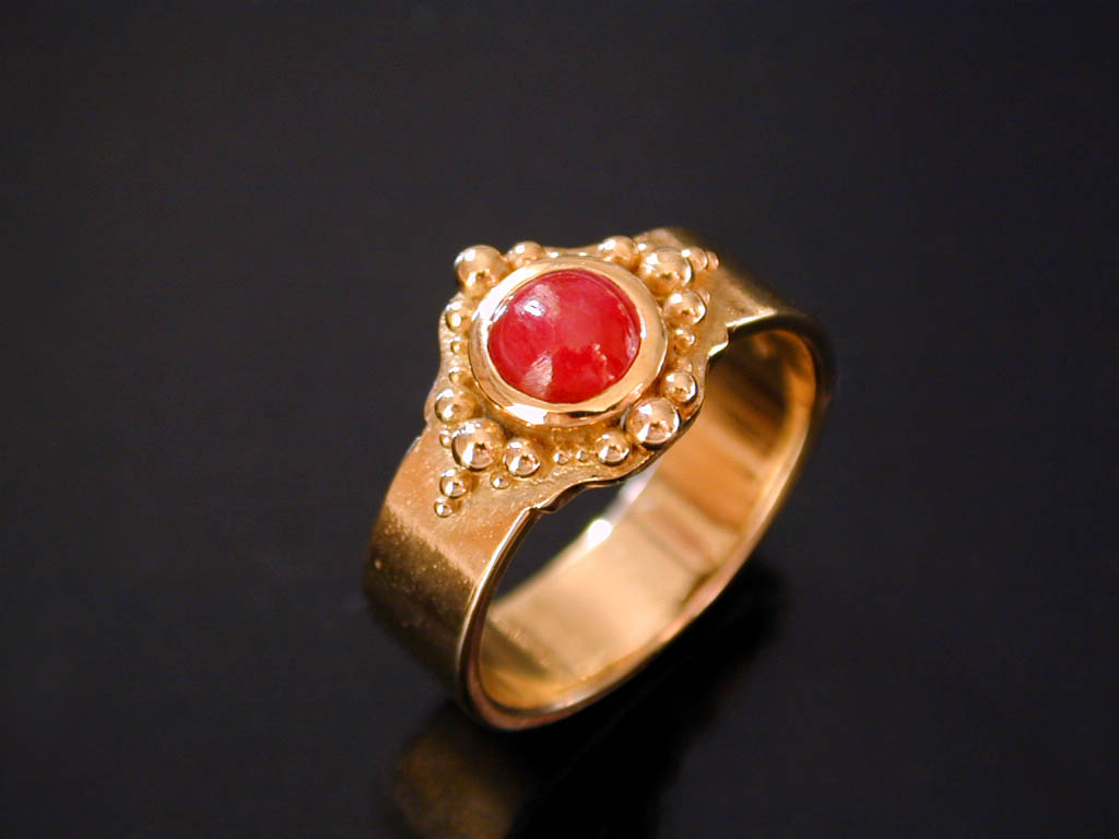 ![]() J 10 Ruby set in granulated yellow gold 0.750 ring size No 54 weight 7.2 gr CHF 1'530.- |