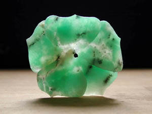 | 01 | The rough Chrysopras has been sliced and a center hole was drilled. |